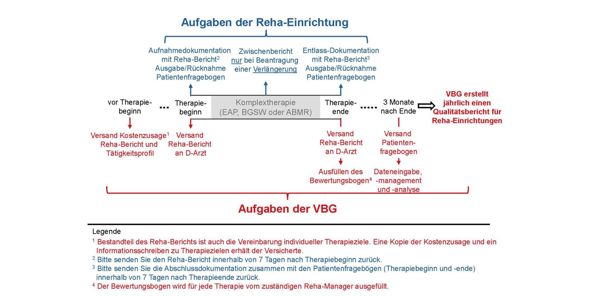 Bei der Entwicklung der VQA wurde besonders darauf geachtet, dass der zusätzliche Aufwand für die Leistungserbringer so gering wie möglich ist. Der Ablauf der Datenerfassung und die hierzu notwendigen Dokumente sind in der folgenden Abbildung dargestellt. Die Aufgaben der Reha-Einrichtung sind in „blau“ und die Aufgaben der VBG in „rot“ dargestellt. Die Legende enthält Informationen zum Inhalt der Dokumente sowie zu den Rücksendefristen an die VBG.